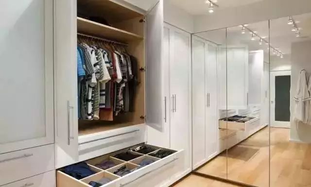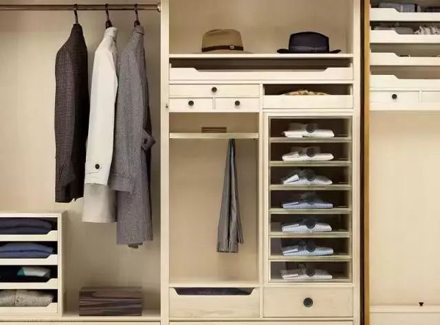 內衣、領(lǐng)帶和襪子可用專(zhuān)用的小格子,既有利于衣物保養,取物也更直觀(guān)方便;毛衣可放在較深的抽屜里;褲子則用專(zhuān)用的掛架存放。