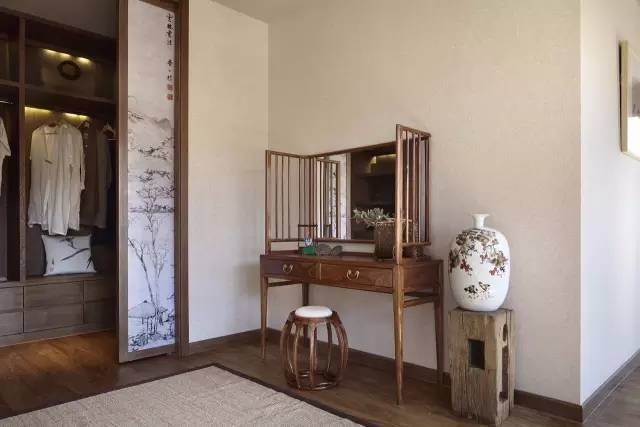 雙開(kāi)門(mén)式梳妝鏡,木格柵拉門(mén)雅趣十足。