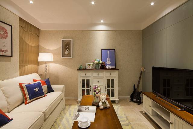 沒(méi)有做吊頂的客廳,用暖色調燈具照樣是住宅引人注目的中心地帶。